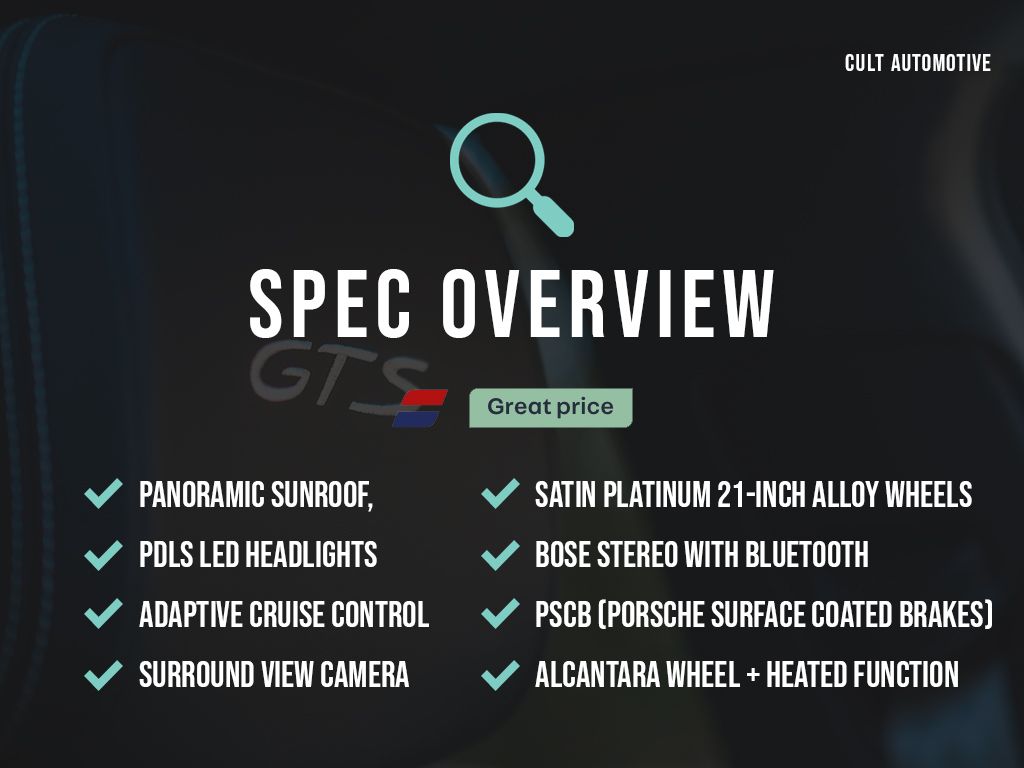Cult Automotive is delighted to present this stunning Porsche Macan GTS for sale, which looks fantastic in Dolomite Silver with contrasting Black Exterior Package, sitting on Satin Platinum 21-inch Alloy Wheels. Inside, there is full Black Leather with Contrast Stitching, Silver Seat Belts, Brushed Aluminium Trim and Treadplates. Being a GTS, the Alcantara Multi-Function Steering Wheel feels fantastic, and also has the optional Heated function. There are 14-Way Memory Seats for driver and passenger, Power Steering Plus, a Panoramic Sunroof, Air Suspension, Adaptive Cruise Control, Surround View Camera with Parking Sensors, Sports Chrono, Comfort Access, Privacy Glass, PDLS LED Headlights, Sports Exhaust, Wireless Phone Charging, and the BOSE Stereo with Bluetooth, DAB Radio, and Apple CarPlay. The car also boasts the rare PSCB (Porsche Surface Coated Brakes) option, with a tungsten-carbide coating improving brake performance, whilst reducing brake fade, brake dust and cost, with Porsche claiming they can last up to 2 years longer than regular discs.