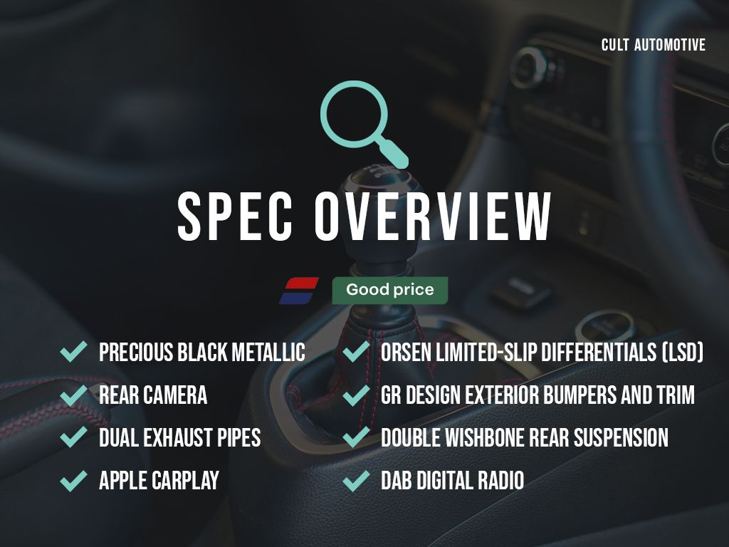 Cult Automotive is delighted to present this 2-owner Yaris GR Circuit Pack finished in Precious Black for sale. Our example here is in excellent condition, confidently shown through a range of close up interior and exterior images and a walk around video. The car has Full Toyota Service History, with the last service carried out in August 2025. Maintaining Toyota history allows the next owner to take advantage of the Toyota 10 Year Warranty. This fantastic car also has an MOT until February 2027. Here at Cult Automotive, we're able to offer competitive Finance and Part Exchange valuations. We also install Ghost Immobilisers, Trackers and supply G Techniq Ceramic Coating. For any questions, please don't hesitate to contact the team on 01580 472 911 by phone or WhatsApp. Please note, the specification for this vehicle includes automatically generated elements. If any of the specification is crucial to your purchase, please confirm with us beforehand.
